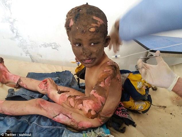 Một trong những bức hình gây sốc cho thấy 1 bé trai ngồi trên giường bệnh với những vết bỏng nghiêm trọng trên cơ thể.