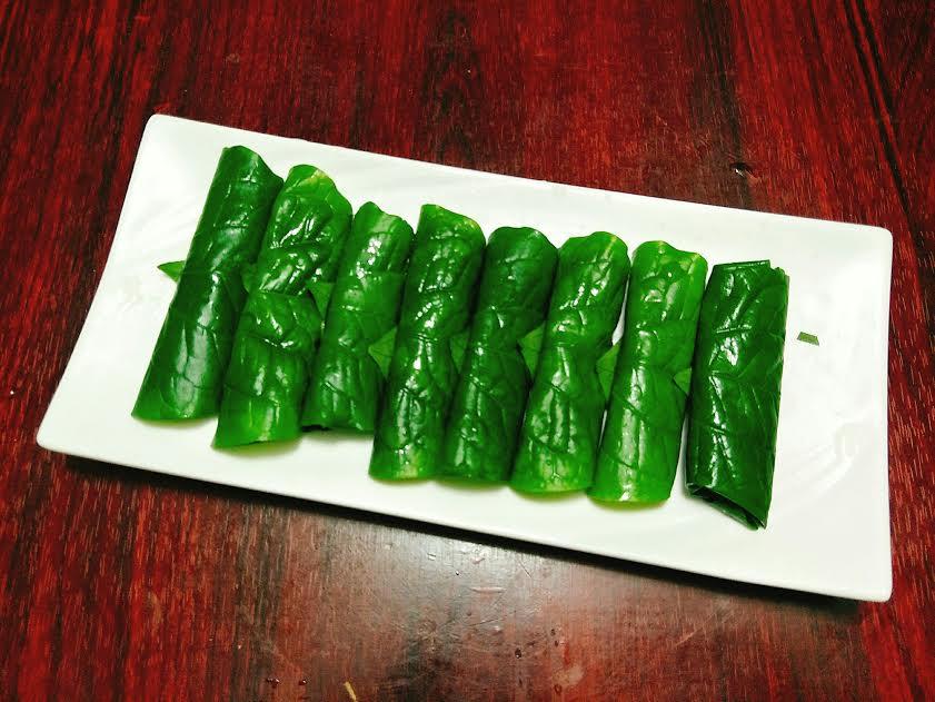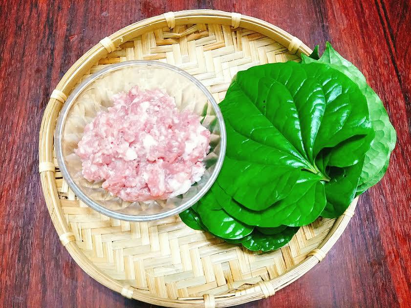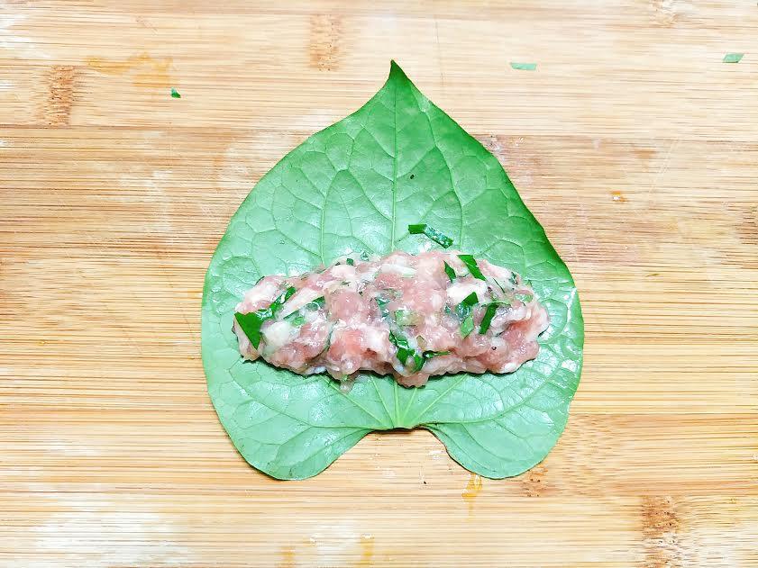 Bạn lấy lá lốt đặt xuống thớt, phần mặt trái lá lốt ngửa lên trên để khi cuộn chả phần lá màu xanh sẽ ở bên ngoài nhìn hấp dẫn hơn nhé. Lấy thìa múc 1 muôi nhỏ thịt băm cho vào và cuốn lại, nếu cẩn thận hơn bạn có thể dùng tăm ghim lại để giữ cho lá không bị bung ra nhé.