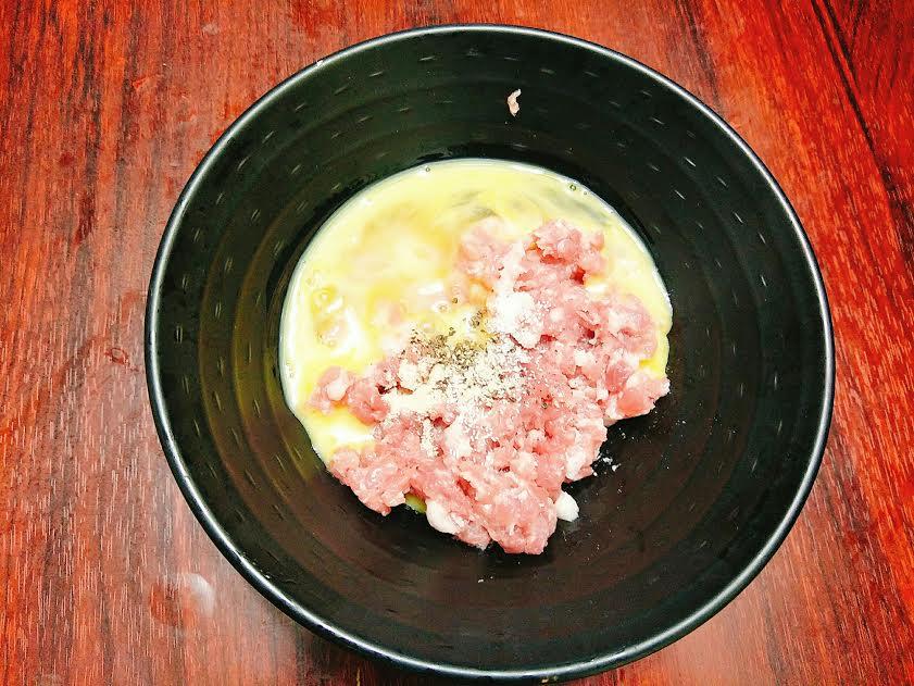 Bạn cho thịt băm vào 1 cái tô sau đó thêm chút bột nêm, muối, tiêu, bột ngọt, trứng gà và dùng đũa đánh đều nguyên liệu cho hòa quyện.