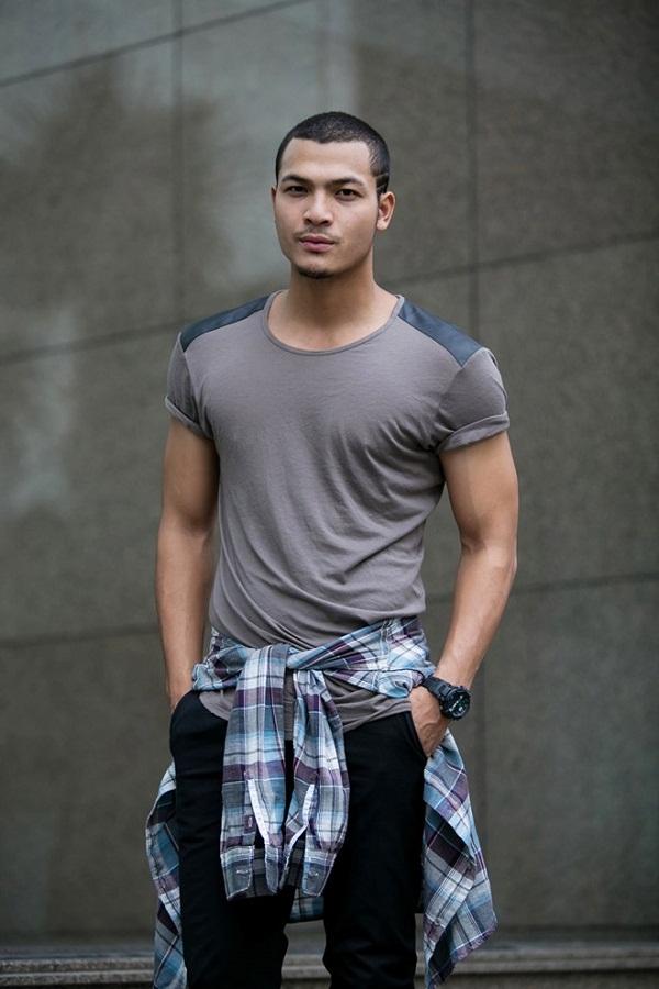Nam người mẫu, diễn viên Vũ Tuấn Việt giữ vững vẻ điển trai, phong độ với đầu đinh.