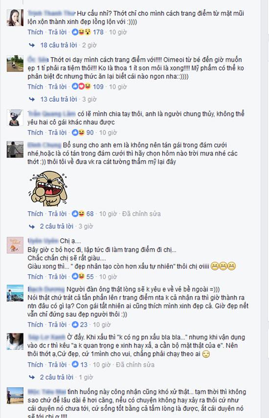 Tâm sự này của cô gái trẻ nhận được nhiều phản hồi của mọi người. Nhiều bạn rất hào hứng với kĩ năng make up chuyên nghiệp của cô gái này: "Thớt ơi dạy mình cách trang điểm với. Oimeoi từ bé đến giờ muốn đẹp 1 tí phải ra tiệm thôi. Không là thoa 1 ít son môi là xong. Mỹ phẩm có thể không phân biệt được nhưng thức ăn lại biết cái nào ngon nha."