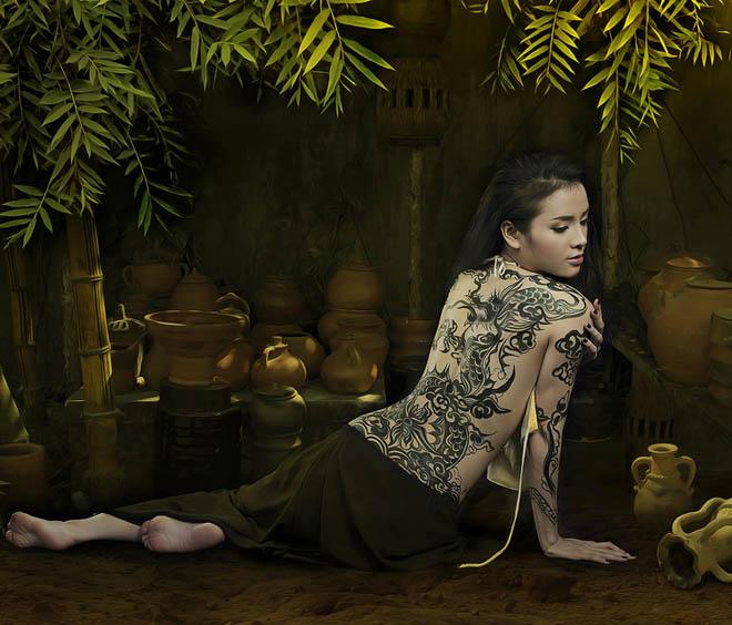 Trong bộ ảnh thực hiện khoảng 3-4 tiếng đồng hồ, Phương Trinh Jolie cho biết cô chỉ sơn vẽ phần lưng, còn phần phía trước vẫn mặc yếm và váy bình thường.