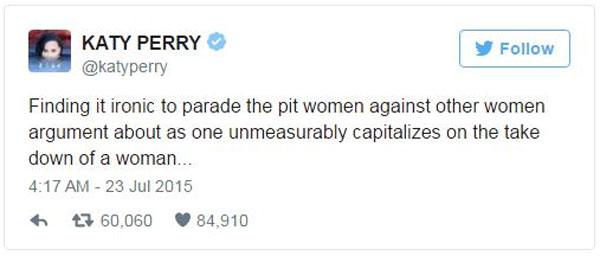 Hành động của Taylor dường như khiến cho Katy rất ấm ức. Còn nhớ, khi Taylor và Nicki Minaj tranh cãi trên mạng, Taylor cho rằng Nicki không nên ganh đua với sao nữ khác, tất cả nên cùng ủng hộ nữ quyền. Katy đã "tranh thủ" mỉa mai Taylor bằng dòng tweet: "Cảm thấy thật đáng mỉa mai khi tranh cãi về chuyện phụ nữ đối đầu với nhau, trong khi một người lợi dụng việc hạ bệ một người phụ nữ khác để kiếm tiền...".