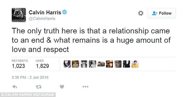 Tuy nhiên, ít lâu sau thì Calvin có vẻ như đã bình tĩnh lại. Anh nhấn "theo dõi" Taylor trở lại và không nhắc gì đến cô bạn gái cũ nữa.