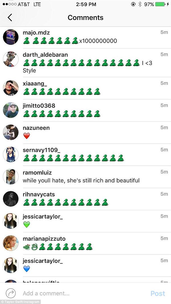 Trên tài khoản Instagram của Taylor, nhiều người còn sử dụng emoji hình con rắn để bình luận, như muốn nói Taylor hiểm độc như rắn. Còn người hâm mộ Taylor thì dùng hình trái tim để đáp lại.