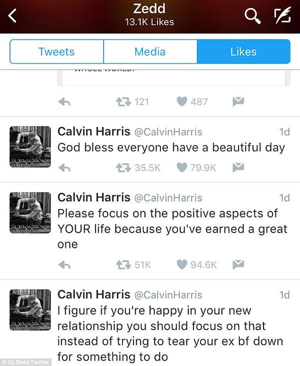 Không trực tiếp chỉ trích Taylor Swift, nhưng sau vụ ồn ào của Calvin Harris, Zedd cũng thể hiện thái độ chống đối nữ ca sĩ này. Trên Twitter, chàng DJ nổi tiếng đã nhấn like cho những dòng tweet của Calvin, trong đó có dòng tweet chỉ trích Taylor Swift cố "hạ bệ" bạn trai cũ.