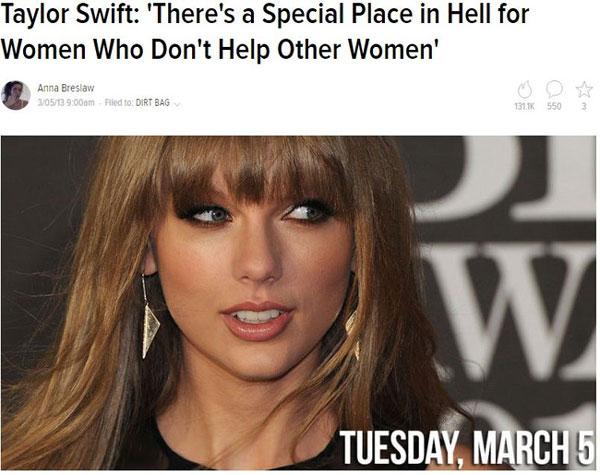 Ngồi bên dưới hàng ghế khán giả vào lúc đó, Taylor hiển nhiên rất "cay". Trong bài phỏng vấn với Vanity Fair, nữ ca sĩ đáp trả Tina và Amy một cách nặng nề. Cô trích lại câu nói nổi tiếng của nhà văn Katie Couric: "Có một nơi đặc biệt dưới địa ngục dành cho những phụ nữ không giúp đỡ những phụ nữ khác".