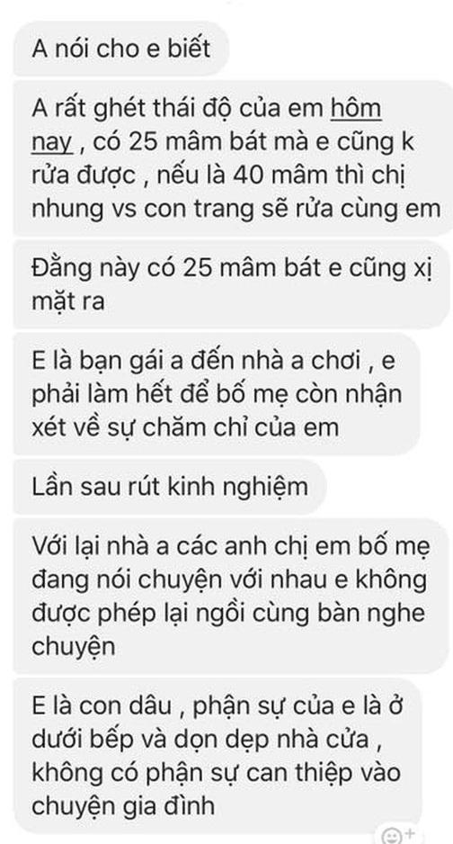 Chàng trai viết: "Anh nói cho em biết. Anh rất ghét thái độ của em hôm nay, có 25 mâm bát mà em cũng không rửa được. Nếu là 40 mâm thì chị Nhung với Trang sẽ rửa cùng em. Đằng này có 25 mâm bát em cũng xị mặt ra. Em là bạn gái đến chơi nhà anh thì phải làm hết để bố mẹ còn nhận xét về sự chăm chỉ của em, lần sau rút kinh nghiệm".
