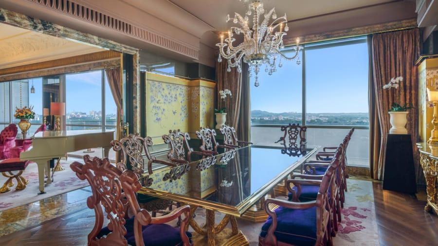 St. Regis Presidential Suite cũng có phòng ăn khang trang với bàn dài phục vụ 12 thực khách. Đầu bếp và đội ngũ phục vụ luôn sẵn sàng mang đến đây những bữa tiệc thượng hạng.