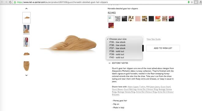 Nhưng, tất cả chúng ta đã nhầm và nhầm rất nặng! Được bán trên Net - A - Porter với giá 2.065 USD (hơn 47 triệu VND), cao hơn hẳn với mức giá niêm yết trên trang chủ cua Gucci nhưng nó vẫn được người ta đặt mua ráo riết và đang chính thức rơi vào tình trạng cháy hàng. Hiện size 38, 39, 40 đã sold out toàn bộ, các size còn lại như 35, 36, 37 cũng chỉ còn rất ít trong kho.