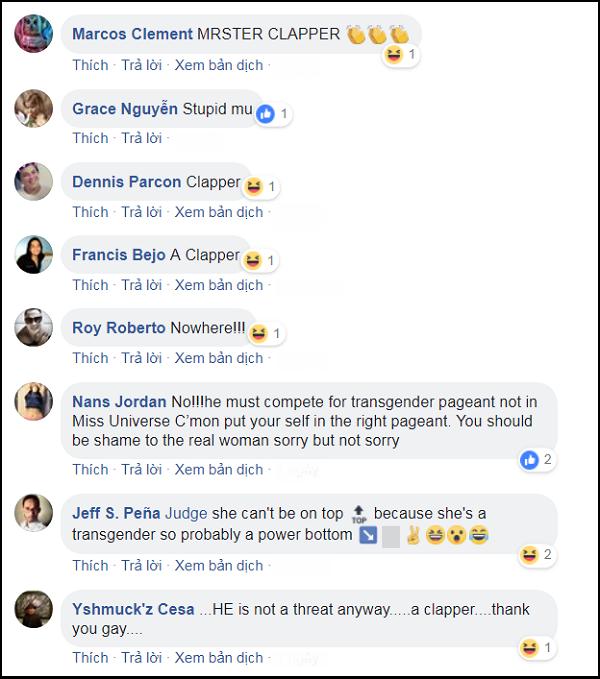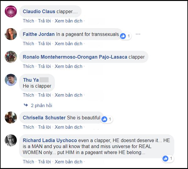 Những ý kiến khác đồng quan điểm: "Cho dù là đứng vỗ tay anh ta cũng không xứng đáng. Anh ta là một người đàn ông và các bạn biết đấy, cuộc thi này chỉ dành cho phái nữ"; "Không có cơ hội tỏa sáng ngay cả thi Hoa hậu Chuyển giới"...