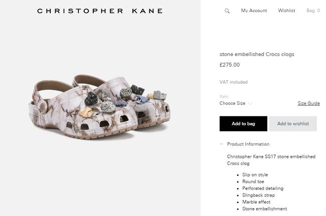 Thực ra, đây không phải là lần đầu tiên Christopher Kane lăng xê cho dép Crocs. Trong bộ sưu tập xuân/hè 2017 trước đó, hãng đã ra mắt mẫu dép Crocs họa tiết marble được gắn những viên đá rất bắt mắt.