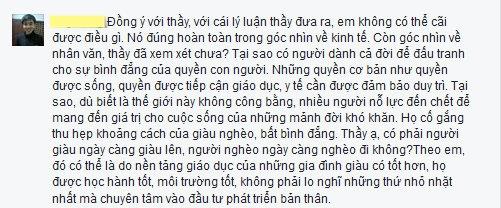 Ngoài ra, cũng có một vài sinh viên cũng lên tiếng ủng hộ thầy P.L.T, cho rằng đây là một góc nhìn khác rất hay, cần được các bạn sinh viên xem xét, nhìn nhận một cách toàn diện.
