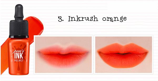 Với tông cam tươi, các nàng hãy tham khảo màu số 3 - Inkrush Orange của son Peripera Ink Velvet.