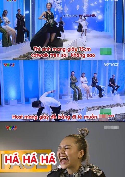 Trong khi dàn thí sinh ai nấy mang giầy 15cm vẫn catwalk trên sỏi một cách tự tin, cú vồ ếch của host The Face đã khiến các huấn luyện viên hốt hoảng, lo sợ.