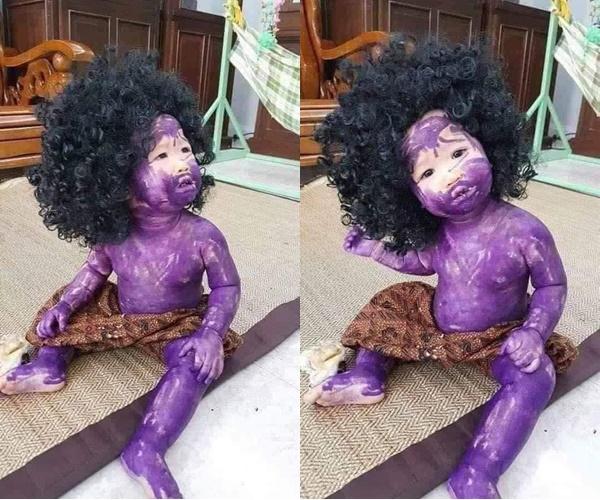 Mới đây, mạng xã hội tích cực lan truyền hình ảnh vô cùng thú vị. Khoảnh khắc ghi lại một cô bé với mái tóc xoăn tít, toàn thân nhuộm một màu tím và chỉ hở duy nhất phần da gần mắt. Nhìn hình ảnh, ai cũng đoán được đây là kết quả sau màn nghịch ngợm của nhóc tỳ.