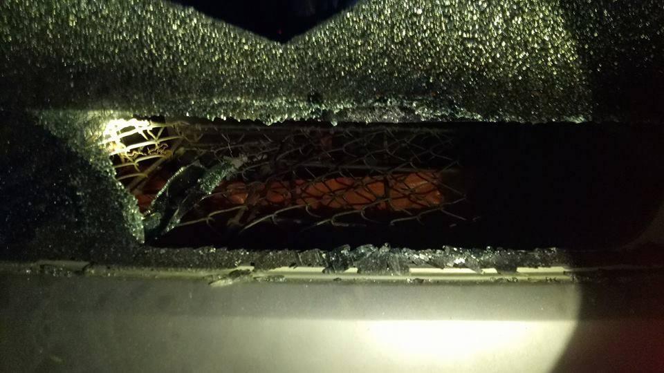 Tại hiện trường, xe ô tô bị người dân đập vỡ kính sau. Dãy ghế phía sau bị tháo để gắn thêm một cái lồng sắt đựng chó, trong xe có nhiều bao bì.