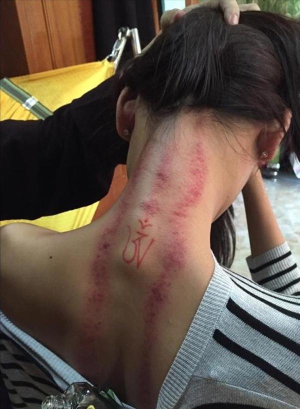 Hai vệt đỏ kéo dài cùng ký tự lạ trên đốt sống cổ của Lê Thúy được Phương Thanh khẳng định là bị "ngải vật".