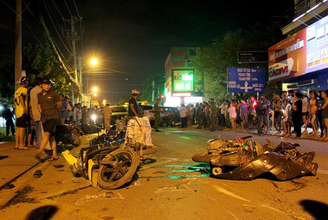 Theo ghi nhận tại hiện trường, 9 xe máy nằm la liệt kéo dài tới 30 m. Ô tô 7 chỗ màu trắng (biển kiểm soát Bình Dương) được cho là gây tai nạn bị hư hỏng nặng, bị chặn lại bởi chiếc taxi Mai Linh. Nhiều bộ phận của ôtô cũng vỡ văng tung tóe.