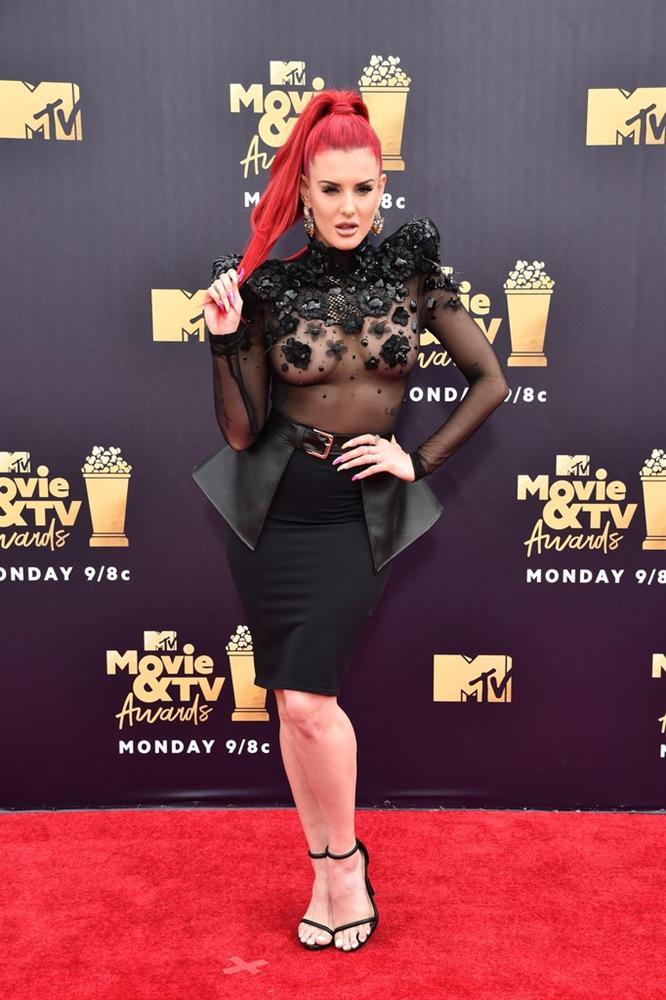 Thảm đỏ MTV 2018 gây sốt vì xuất hiện những bộ trang phục kì dị, hở bạo. Justina Valentine gây nhức mắt với áo ren trong suốt thả rông vòng 1.