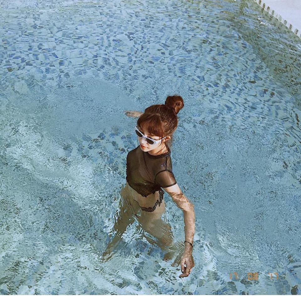 Salim thư giãn trong làn nước xanh mát tận hưởng kì nghỉ lễ. Dù chỉ là đi bơi, nàng hot girl Hà Thành vẫn rất style.