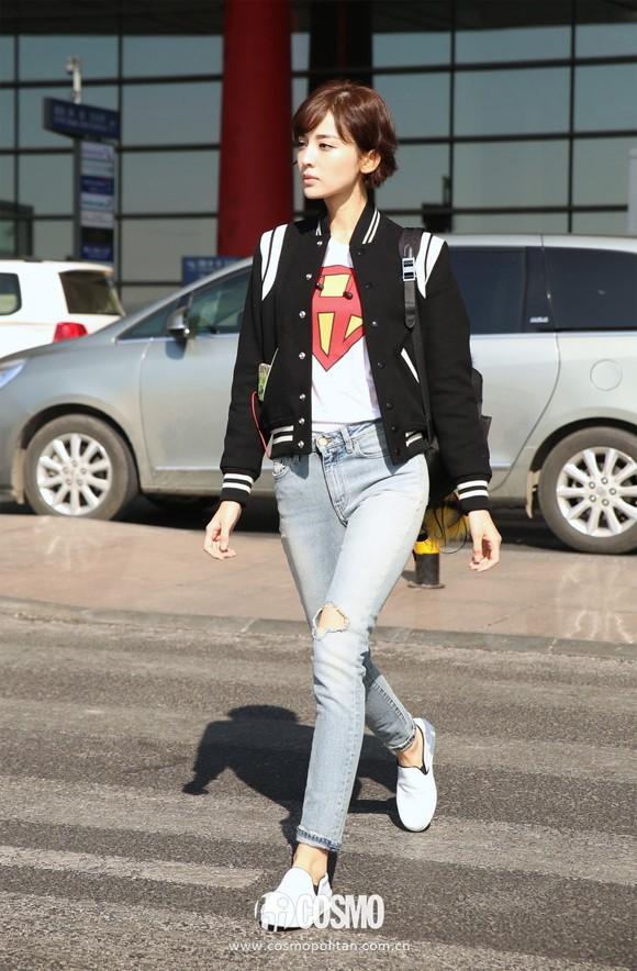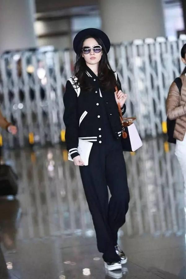 Lưu Diệc Phi trẻ trung và cá tính với áo khoác bomber tông đen-trắng mix cùng quần vải ống rộng và sneakers ánh bạc.