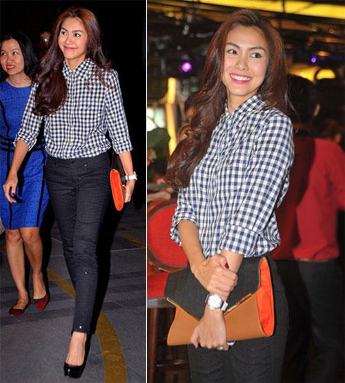 Tăng Thanh Hà thường hay mặc áo sơ mi kết hợp quần jeans và đeo