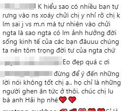 Trước những bình luận nặng lời, Nhật Lê hiện chưa có bất kỳ phản hồi nào. Thế nhưng, những người yêu mến đã lên tiếng bênh vực cô nàng. "Không hiểu sao có những bạn tự nhiên vào nói xoáy chị ấy. Rõ ràng chị ấy không làm sai gì mà lại vào chửi, làm ảnh hưởng đến người ta. Chúng ta nên tôn trọng đời tư của người khác. Đừng để ý những lời nói không tốt chị ạ. Họ chỉ là những người ghen ăn tức ở thôi. Chúc chị Lu và anh Hải hạnh phúc nhé".