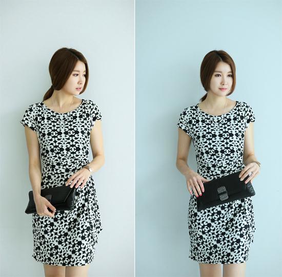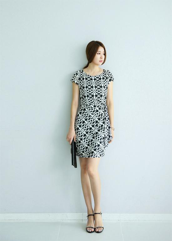 Khi mặc váy liền thân, bạn không nên lựa chọn mẫu thiết kế quá cầu kì và diêm dúa. Với một chiếc váy họa tiết hoa văn trắng đen, bạn nên kết hợp thêm clutch đen "đúng điệu". Đôi xăng đan quai đen thanh mảnh sẽ giúp dáng bạn uyển chuyển hơn. Mặt khác, kiểu tóc đuôi ngựa buộc thấp là item hot giúp gương mặt trông dịu hiền. Mỗi sáng đi làm vội vã, bạn hãy "tậu" ngay style đơn giản nhưng lại mang tính thẩm mỹ cao này.
