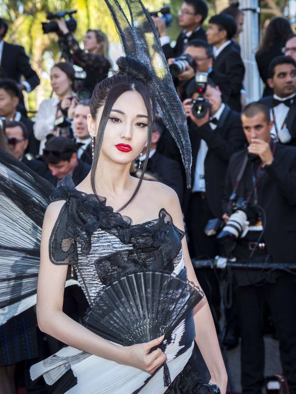Với thiết kế có phần quái dị này, nữ diễn viên chọn tone trang điểm son đỏ cùng phụ kiện quạt cầm tay mang đậm vẻ đẹp phương Đông Trung Quốc.