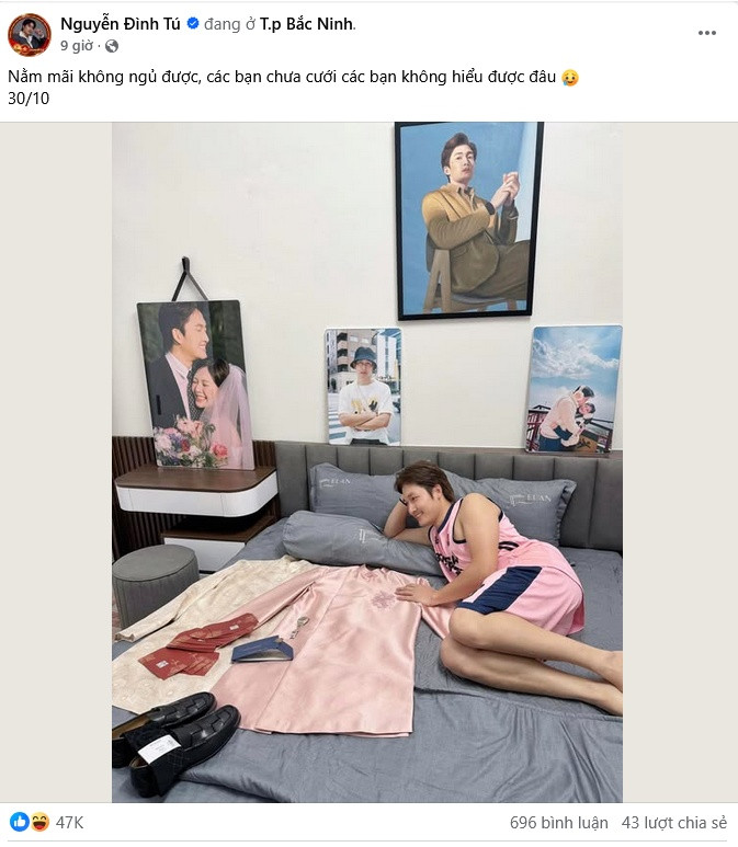 Trước giờ G, Đình Tú còn có chia sẻ gây chú ý trên trang cá nhân. Theo đó, anh viết: "Nằm mãi không ngủ được, các bạn chưa cưới các bạn không hiểu được đâu."