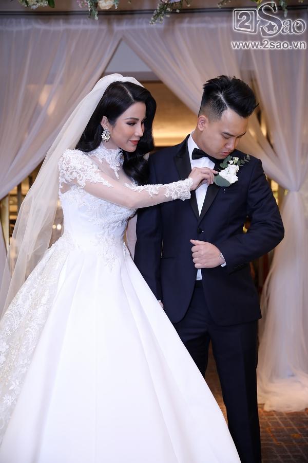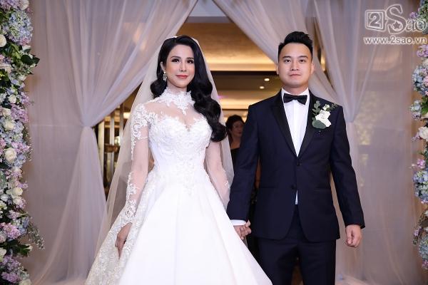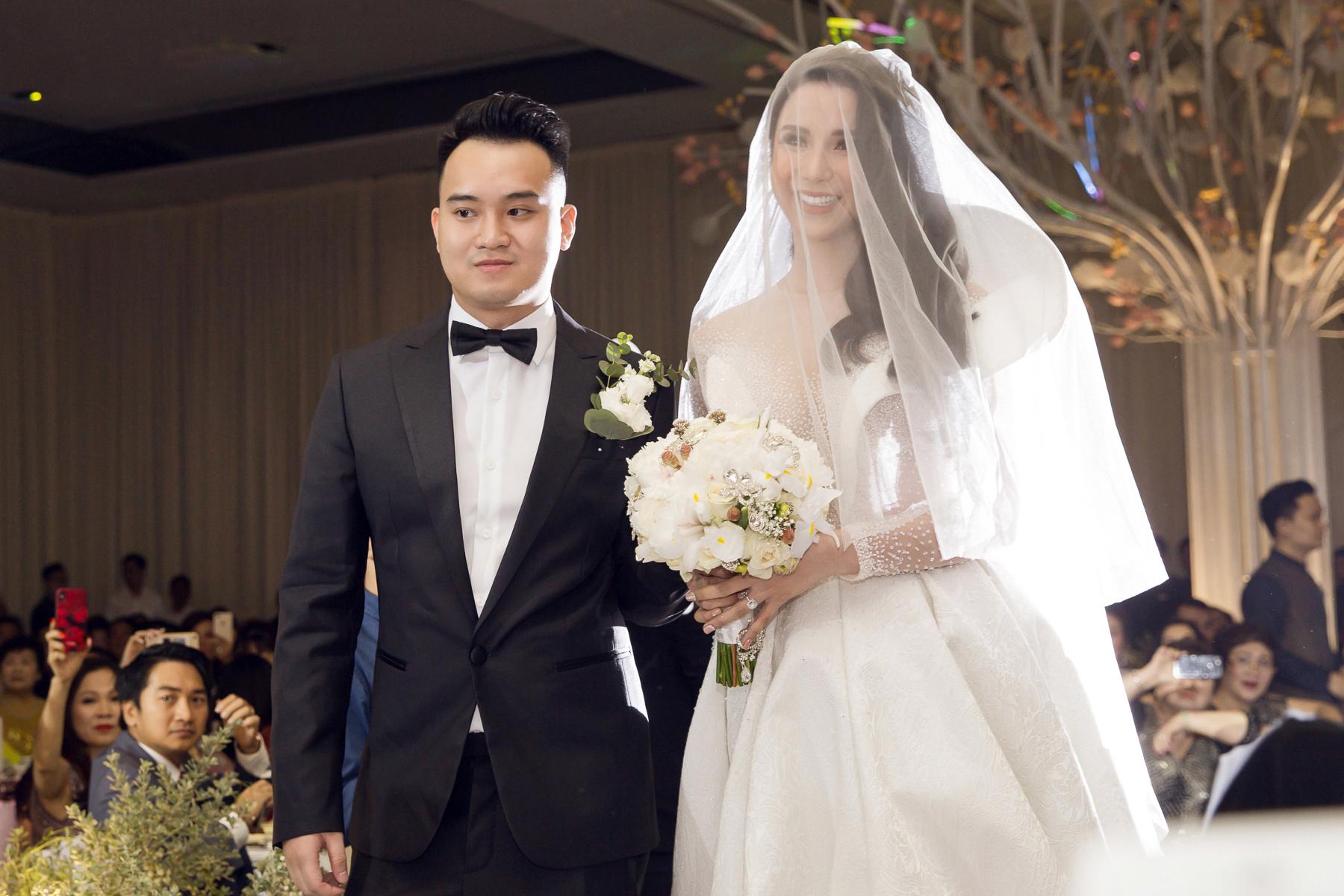Trong bộ váy cưới màu trắng, cô dâu Diệp Lâm Anh bẽn lẽn cùng ông xã tiến vào lễ đường.