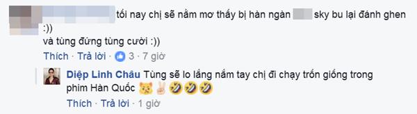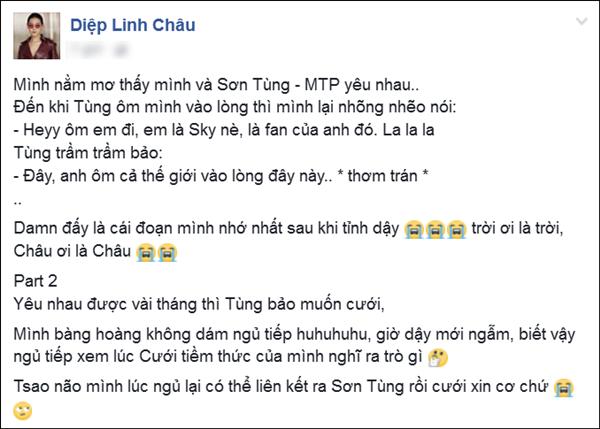 Đăng tải giấc mơ lãng mạn về Sơn Tùng M-TP lên mạng xã hội, Diệp Linh Châu cho biết cô không sợ các Sky "đánh ghen hội đồng". "Tùng sẽ lo lắng nắm tay chị chạy trốn giống như phim Hàn Quốc", stylist Linh Châu đáp lời một fan của Sơn Tùng.
