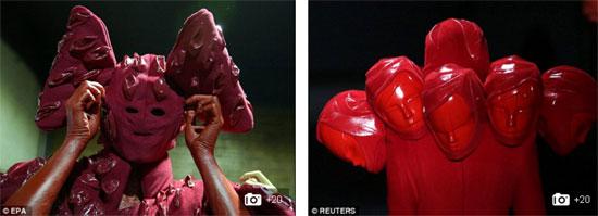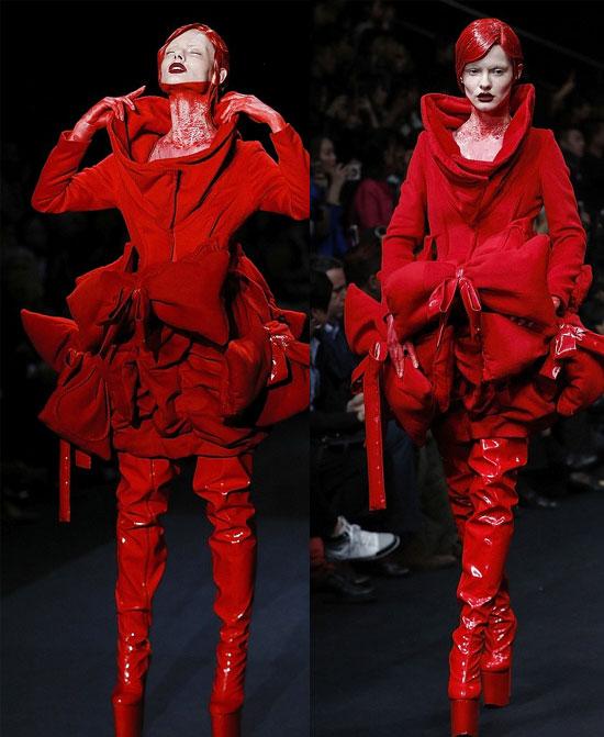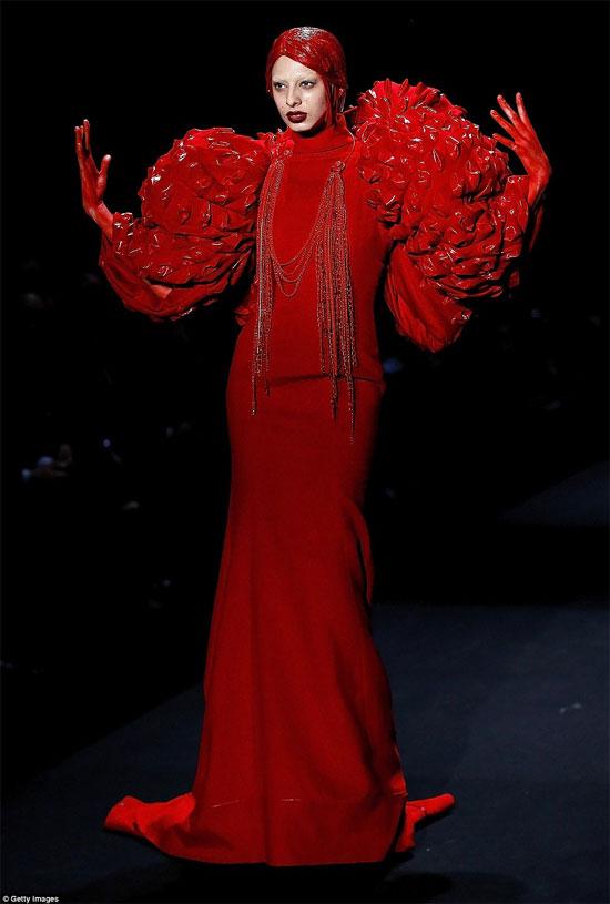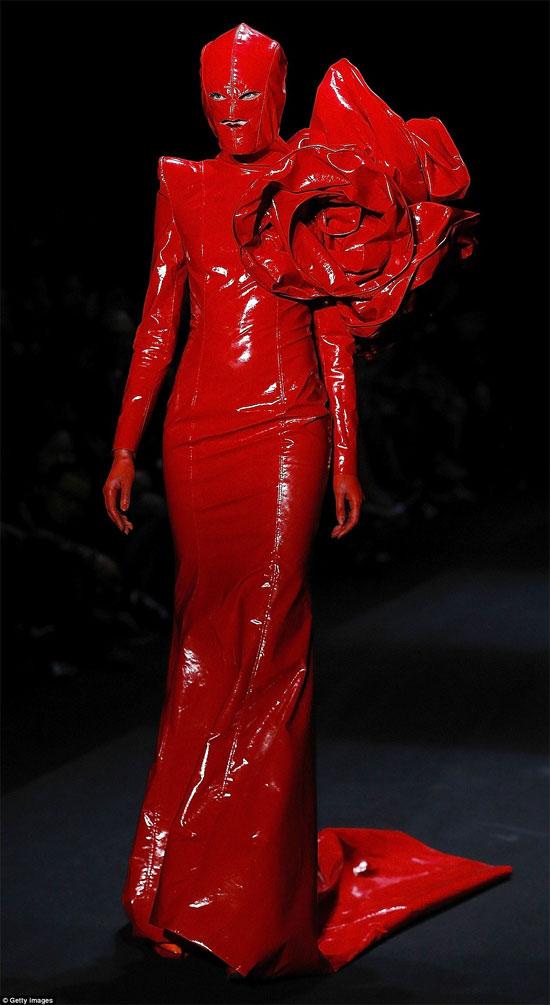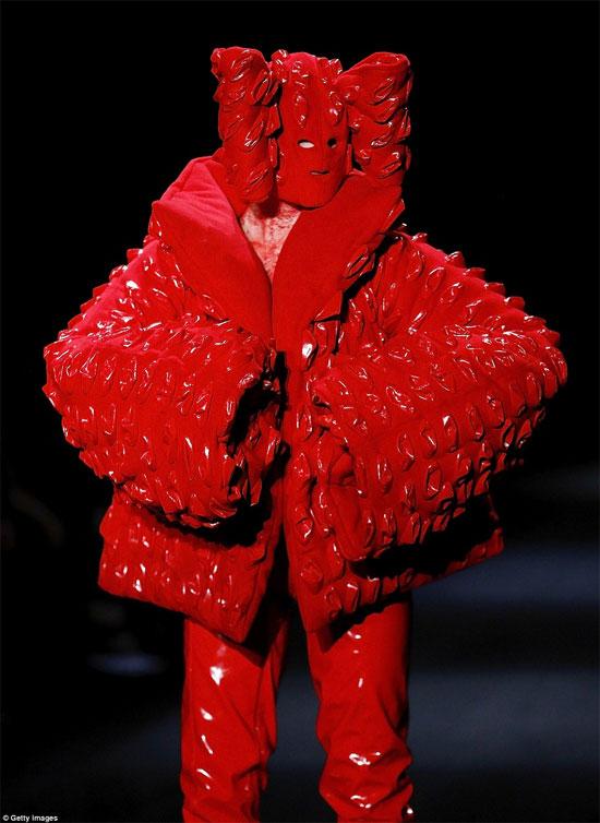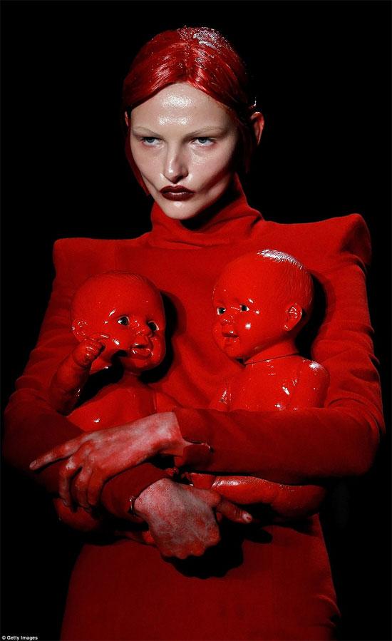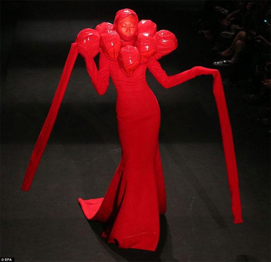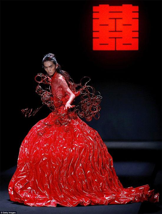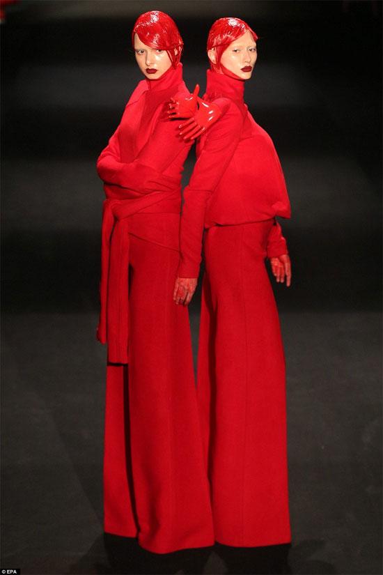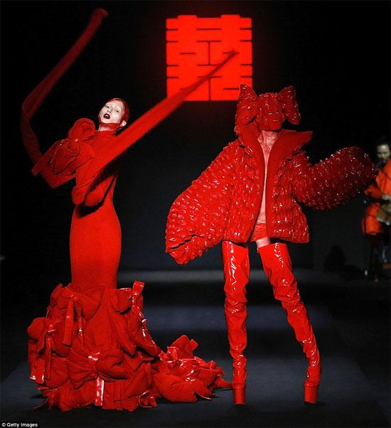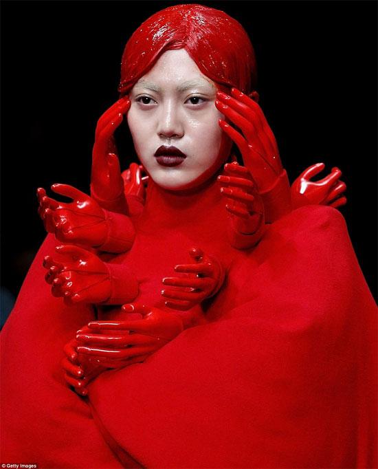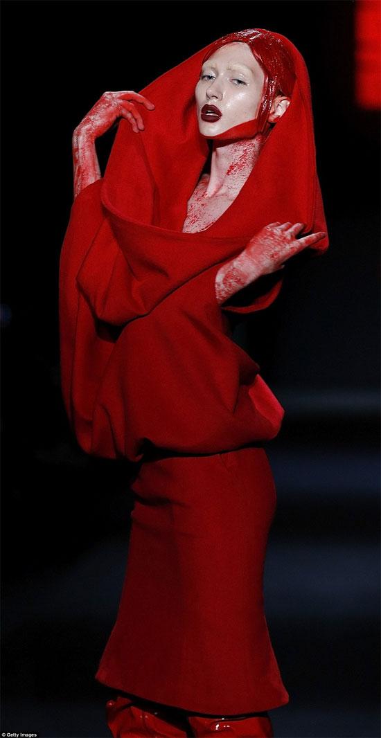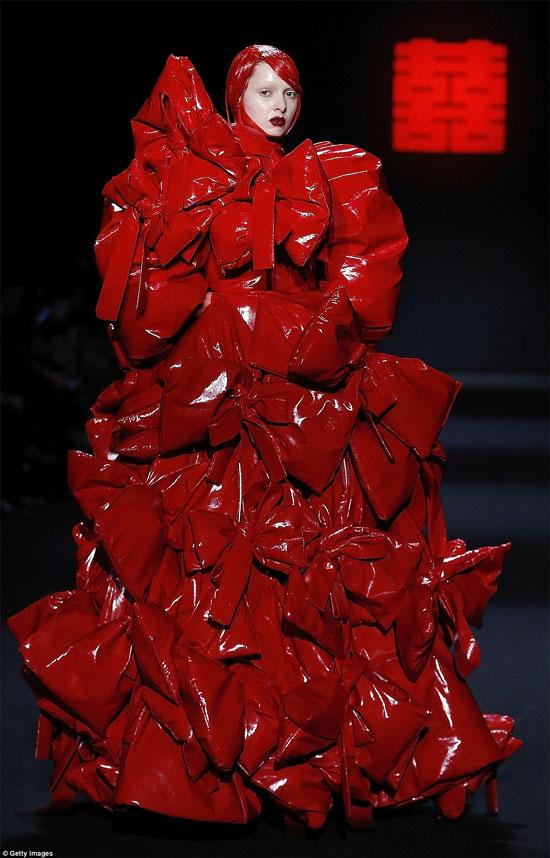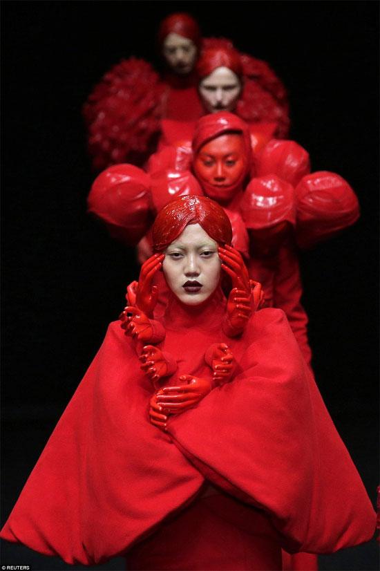 Nếu như Tuần lễ thời trang Tokyo vừa qua xuất hiện những bộ trang phục cá tính, kỳ quặc thì tại Tuần lễ thời trang Trung Quốc diễn ra tại Bắc Kinh mới đây cũng có điều thú vị không kém. Show diễn của Hu Sheguang như mang đến cho khán giả "bộ phim kinh dị" khi đưa ra những người mẫu với các bộ cánh đỏ lòm như máu.