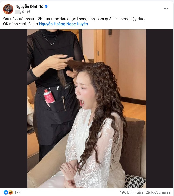 Mới đây, sau đám cưới, Đình Tú có động thái mới trên trang cá nhân. Theo đó, nam diễn viên đăng ảnh "dìm hàng" bã xã kèm dòng trạng thái: "Sau này cưới nhau, 12h trưa rước dâu được không anh, sớm quá em không dậy được. OK mình cưới tối luôn Nguyễn Hoàng Ngọc Huyền."