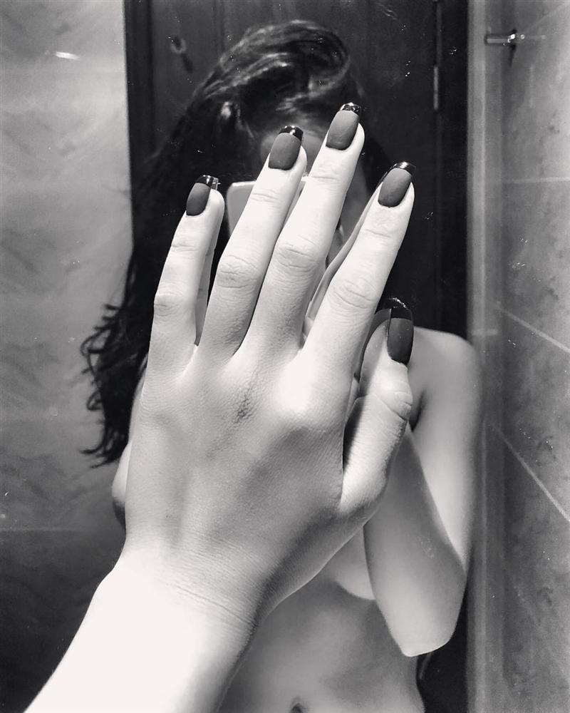 Trong ảnh, nữ DJ đã trút bỏ toàn bộ xiêm y khéo léo dùng tay che chắn vòng một, tay còn lại cầm điện thoại check in. Hình ảnh được cô sử dụng tông trắng đen để nâng cao tính thẩm mỹ.