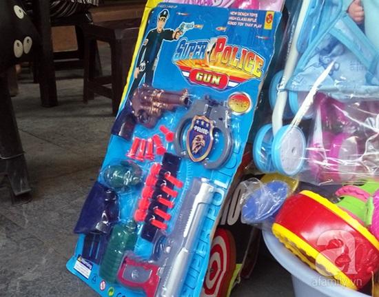 Một vỉ đồ chơi giá 35 nghìn đồng bày bán giữa thanh thiên bạch nhật với các mặt hàng gồm: 2 khẩu súng (1 colt, 1 súng ngắn); 1 quả lựu đạn, 1 còng số 8, 1 bộ đàm và nhiều viên đạn nhựa.