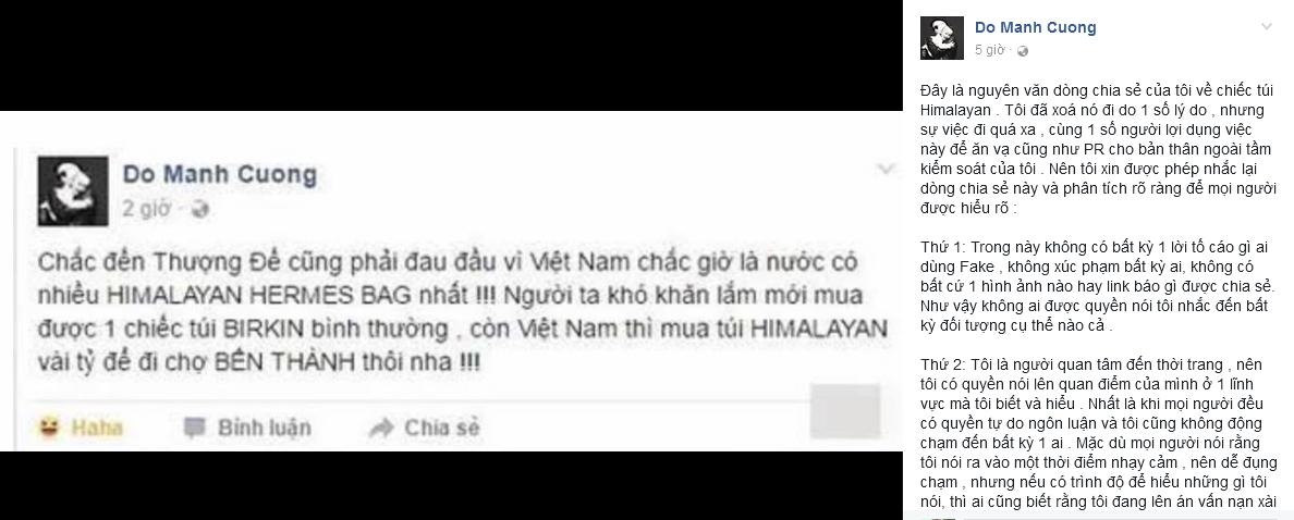 Giữa lúc nhận xét "xách túi Birkin đi chợ Bến Thành" của Đỗ Mạnh Cường đang là chủ đề nóng, nhà thiết kế họ Đỗ bất ngờ xóa bỏ dòng chia sẻ đã đăng tải. Tưởng câu chuyện đã trôi qua, nhưng mới đây Đỗ Mạnh Cường bất ngờ đăng tải bức tâm thư mới, đồng thời nhắc lại bài viết đã xóa trước đó.