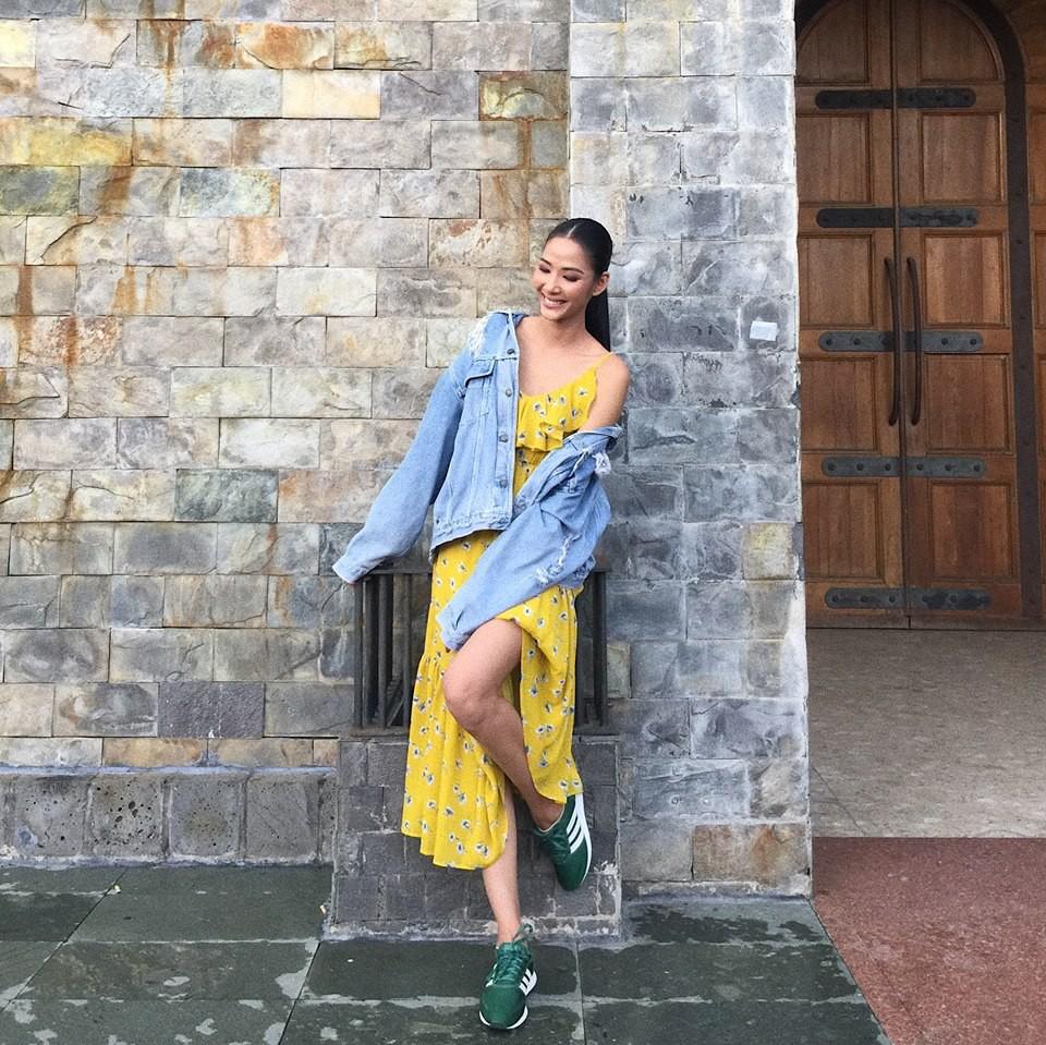 Sự pha trộn giữa váy hoa nữ tính với áo khoác jeans rách, giầy sneaker năng động biến street style Hoàng Thùy trở nên bắt mắt.