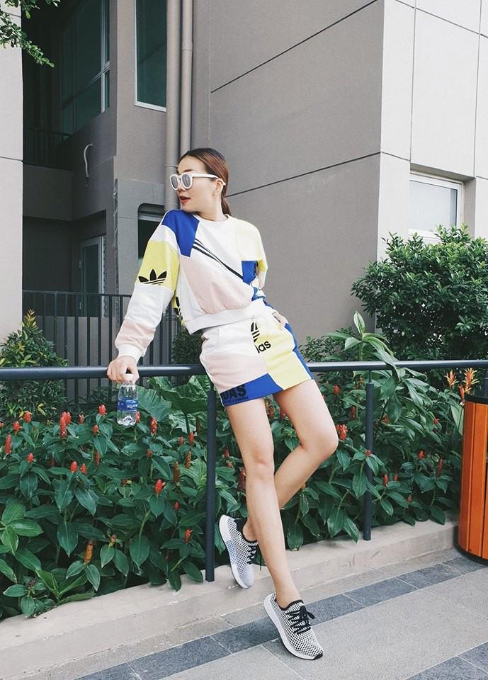 Thanh Hằng khoe chân thon dài 1m12 trong set đồ thể thao năng động của Adidas.