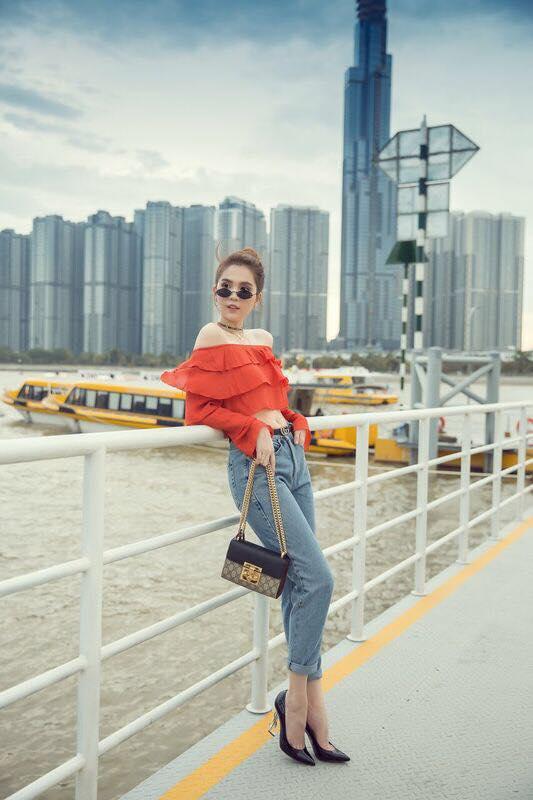 Ngọc Trinh khoe vòng eo 56 với áo croptop, quần jeans. Người đẹp nâng tầm set đồ bằng loạt phụ kiện hàng hiệu túi và thắt lưng Gucci, giầy cao gót Saint Laurent.