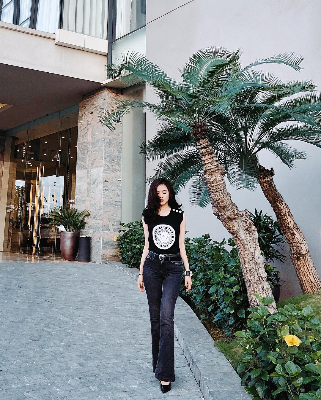 Tâm Tít hack chân dài với công thức mix đồ quần ống loe sơ vin áo. Nàng cựu hot girl vẫn trung thành với sắc màu đen từ street style đến thảm đỏ.