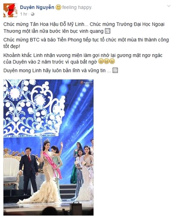 Và ngay sau khi Đỗ Mỹ Linh đăng quang, Hoa hậu Kỳ Duyên cũng đã gửi lời chúc mừng đến thế hệ kế nhiệm mình. Kỳ Duyên nhắn nhủ với Mỹ Linh 'rằng hãy luôn bản lĩnh và vững tin'. Thật khó tin khi 2 năm trước người tới chúc mừng Kỳ Duyên lại trở thành Hoa hậu kế nhiệm.