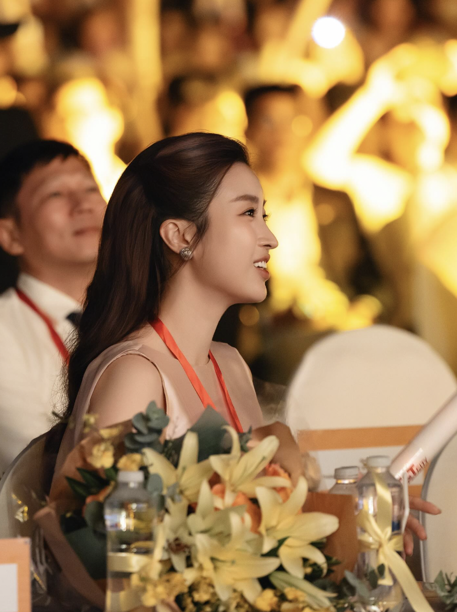Ở một khung hình khác, Đỗ Mỹ Linh ngồi tại hàng ghế khách mời, chăm chú theo dõi sự kiện. Ở góc máy cận cảnh, nàng hậu càng nổi bật bởi vẻ đẹp dịu dàng, sang trọng. Từng cử chỉ, ánh mắt, nụ cười đều toát lên sự nền nã, đúng chuẩn hình ảnh "nàng dâu hào môn".
