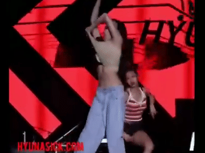 Nếu như người xem chẳng mấy bất ngờ với động tác bưng ngực trong bài Lip & Hip thì HyunA đã "tiến thêm một bước" táo bạo bằng cách cởi phăng chiếc áo đang mặc để diện bikini khi hát RED, Bubble pop!.