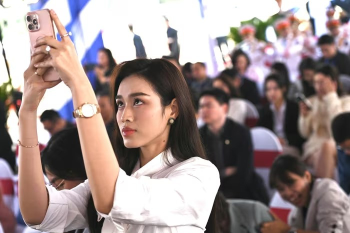Xuất hiện tại sự kiện, hoa hậu Đỗ Thị Hà ra dáng phu nhân hào môn khi chẳng cần lên đồ cầu kì vẫn hút trọn ống kính. Theo đó, nàng hậu diện áo sơ mi trắng, trang điểm và để tóc xoăn lơi nhẹ nhàng khoe visual duyên dáng mà vẫn sang chảnh. Trong khi đó, ông xã Viết Vương bảnh bao, phong độ trong bộ suit đen.