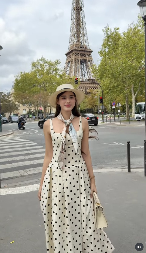 Trong đoạn clip mới, Đỗ Thị Hà khoe nhan sắc rạng rỡ, tươi tắn đúng chuẩn người phụ nữ ngập tràn trong tình yêu. Cô diện chiếc đầm dài chấm bi phối cùng khăn quàng cổ, mũ rộng vàng... ngày càng ra dáng dâu hào môn. Chân dài còn nâng tầm diện mạo bằng phụ kiện đồng hồ xa xỉ và túi xách Hermès giá 700 triệu đồng.