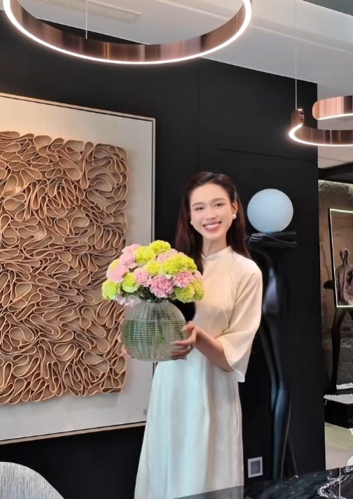 Đỗ Thị Hà khoe nét dịu dàng khi lựa chọn áo dài và đứng cắm hoa. Trước đó, chân dài cũng gây sốt với loạt clip cắm hoa được nhiều người khen hết nấc. Hai tác phẩm hoa sen và hoa ly kép hút gần 2 triệu lượt xem.