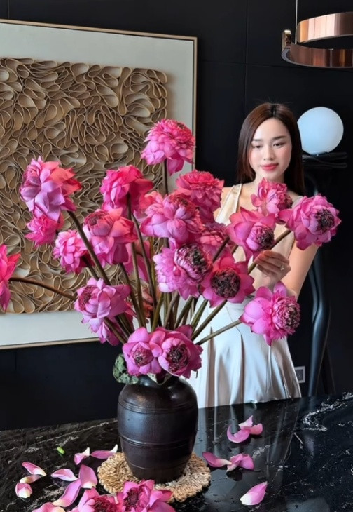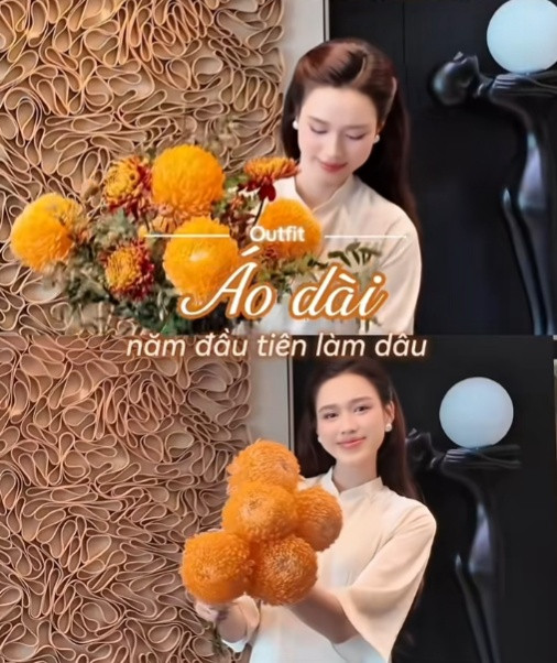 Đỗ Thị Hà khoe nét dịu dàng khi lựa chọn áo dài và đứng cắm hoa. Trước đó, chân dài cũng gây sốt với loạt clip cắm hoa được nhiều người khen hết nấc. Hai tác phẩm hoa sen và hoa ly kép hút gần 2 triệu lượt xem.