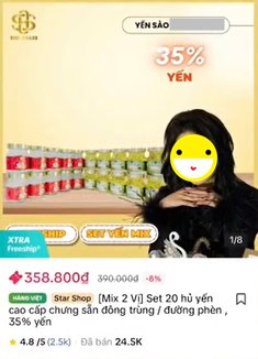 Tiếp đó, đến tháng 10/2024, sản phẩm yến sào do chị S., bán được quảng cáo thành phần có 35% yến, niêm yết với giá 390k/ 20 hũ. Tuy nhiên, nếu được áp mã giảm giá, sản phẩm chỉ còn 359k (tính ra khoảng 18k/ hũ).